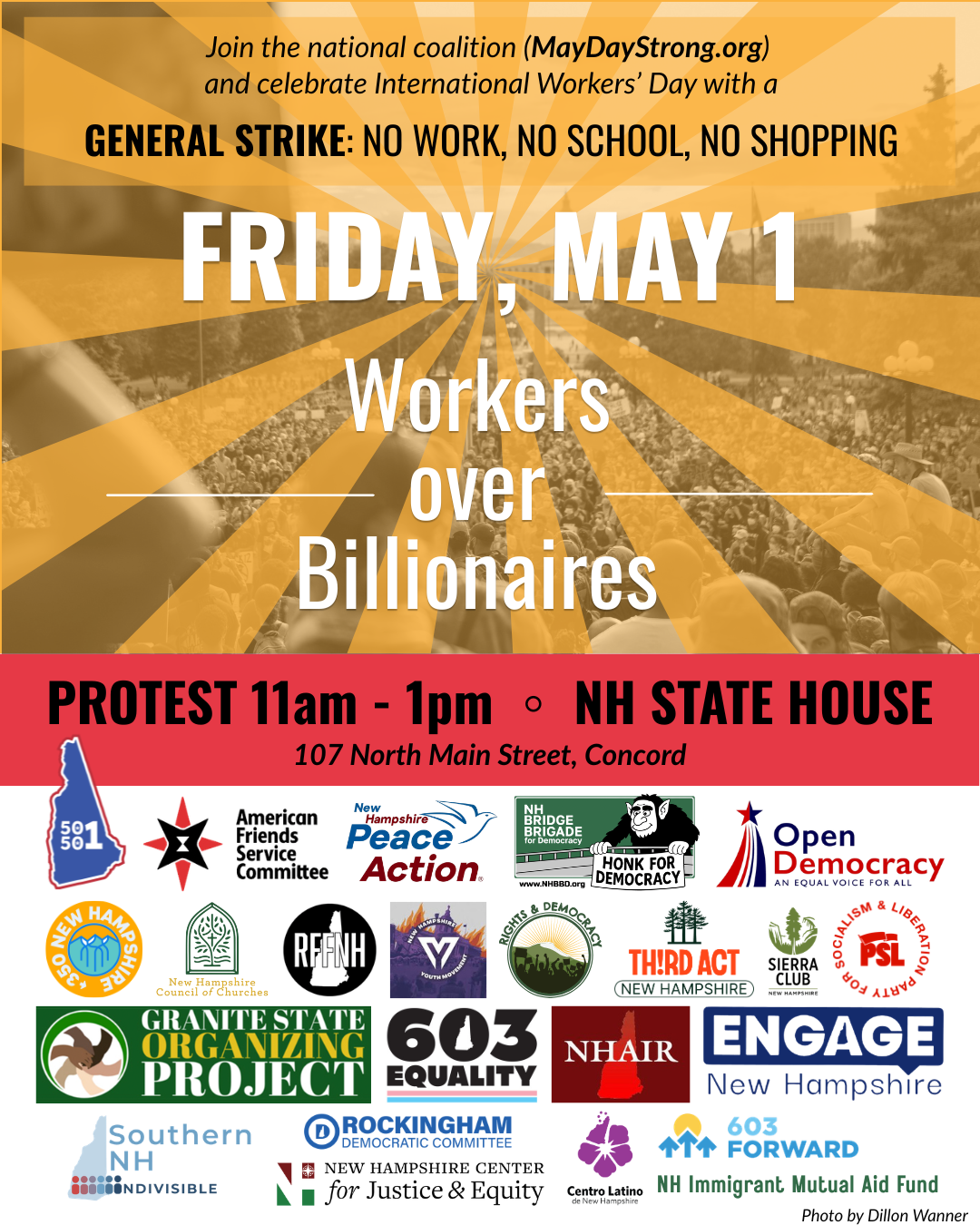 On Friday, May 1st, NH 50501 is rallying at City Plaza in front of the New Hampshire State House - 11am to 1pm in Concord. We're joining communities across the country in a nationwide day of action: marches, rallies, and a clear message that families come before fortunes, democracy before corporate power.